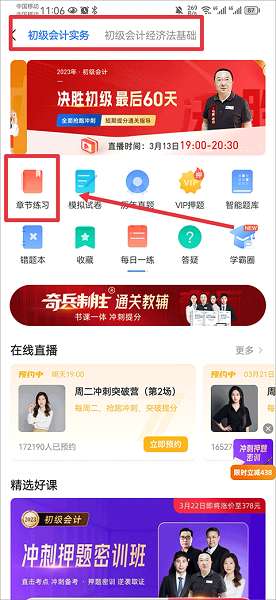 2、然后在上方选择练习初级会计实务还是初级会计经济法基础,并在下方点击章节练习。