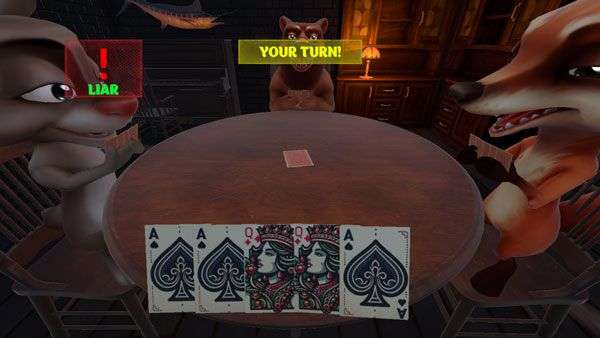 3、每一轮打牌的顺序都是随机的,轮到玩家后你可以选择掀牌或者是自己出牌,如果玩家们选择掀牌,就需要查看对手出的牌是否符合标准,如果不符合标准那么该玩家们就需要收到子弹的惩罚;