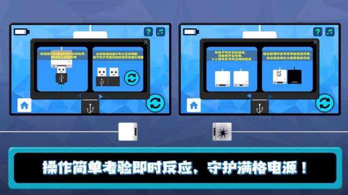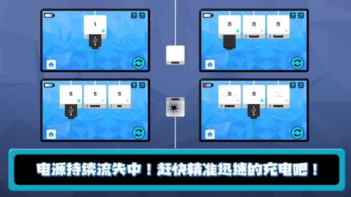 昨又即时充电在这里面会有很多不同的充电数据接口但是每一个释放的电流都是不同的还有就是上面显示的数字都是不一样的,在这里想要快速的判断自己的操作是否正确多次的尝试然后找到一些适合自己的技巧。每一个关卡的电量都是直接开启的所有为了不让电量流失掉大家要加快自己的速度完成充电的挑战,在充电的时候会有一些相似的点可以看到充电数据线上面的口可以连接的位置是相同的。