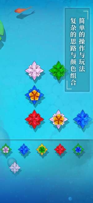 游戏玩法规则很简单,每一朵莲花都有上下两层,将两朵莲花相邻放置,同样颜色的底座和上半部分就会消除,留下来的部分变成底座,通过这种方式,将关卡中的所有莲花都消除掉,即可过关。需要注意的是每一关都有特定的几个无法移动的莲花,想要通关就要将其他莲花合理摆放,并将莲花全部消除。