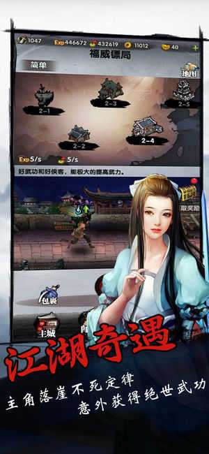 4.高度还原了经典的武侠场景,挂机江湖录有着大量熟悉的武侠角色和华山论剑等经典桥段,挂机江湖录手游还能惩恶扬善以及提高自己的侠客属性。