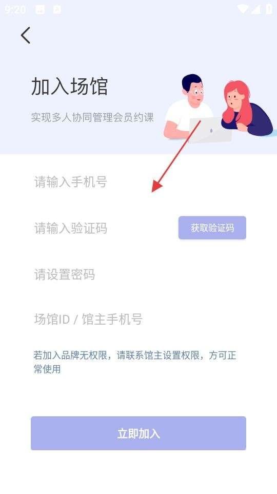 3、加入场馆页面,需输入手机号、验证码,设置密码,还得填写场馆ID或馆主手机号。