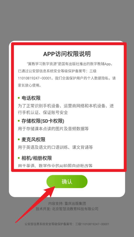2、系统会提示【APP访问权限说明】,包括电话、存储、麦克风和相机权限,请点击【确认】,以保证功能正常使用。