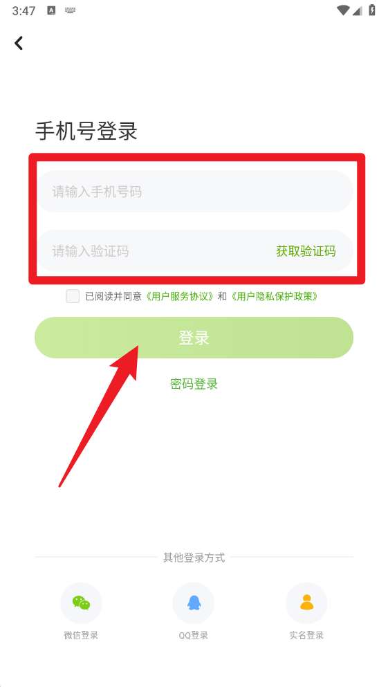 3、在登录界面输入手机号码并获取验证码,确认已阅读协议后点击【登录】,即可快速完成账号注册或登录。