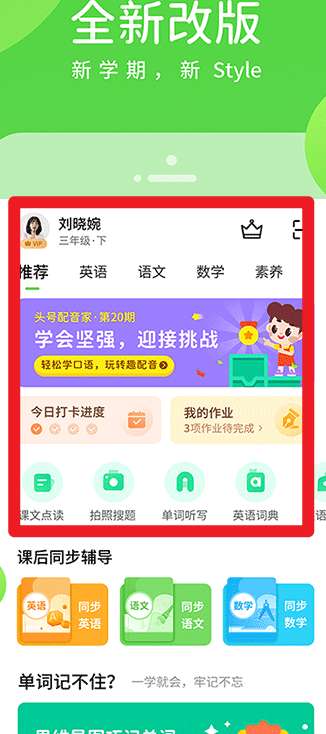 4、进入首页后,可查看学习进度与作业情况,支持课文点读、拍照搜题、单词听写、英语语音等学习功能。