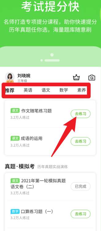 5、在学习课程页面,可选择推荐、英语、语文、数学、素养等模块,进入对应板块进行专项练习与模拟考试。
