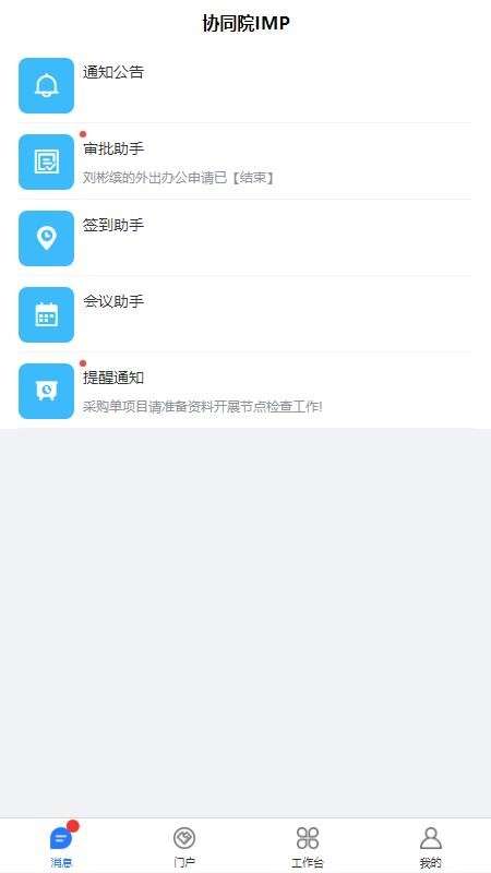 协同院IMP,是一款面向企业的协同办公软件。借助该软件,用户能够添加多个门户并进行在线管理,打造办公专属通讯录,将所有工作人员的联系方式纳入其中统一管理,便于随时查找联系人,实现工作上的实时沟通交流。在这里,各部门工作人员可高效协同办公,有效提升工作效率。同时,软件会实时向用户推送工作中的各类最新消息,使用户能第一时间接收并及时处理工作。不仅如此,用户还能在此快捷高效地完成各项办公申请流程的审批工作。此外,软件配备的会议助手工具,让工作人员日常办公开会变得更为简单便捷。有需求的用户,快来使用协同院IMP吧!
