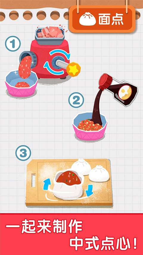 3、交互式烹饪步骤:拖动并单击以完成搅拌和烧烤等操作,模拟真实的烹饪过程并锻炼手的精细运动技能。