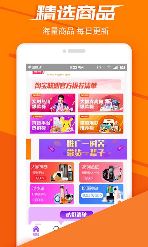 主要用于共享主流电子商务平台产品,加入CPS联盟,向用户分享高佣金热销产品