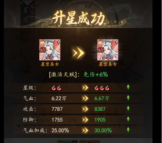 星宫圣女升级到8星以后,就可以将免伤增加6%,所以如果想要提升伙伴的伤害或者属性,最好的情况就是把他们提高到最高星,以激活更多的天赋技能。