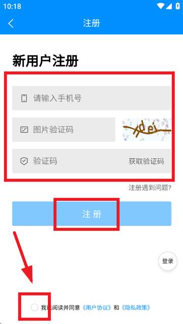 输入手机号,图片验证码,验证码,勾选我已阅读并同意 《用户协议》 和 《隐私政策》,点击注册即可。