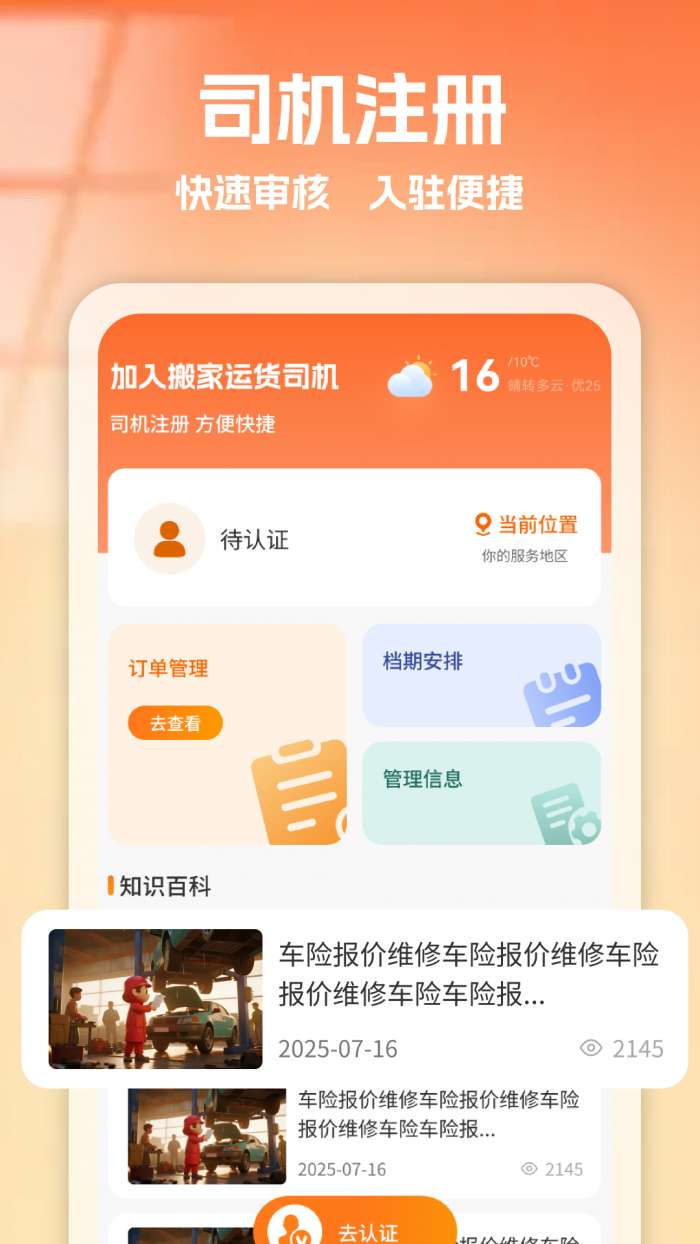 1、司机注册与订单管理。极速注册流程简单快捷,帮助货车车主快速完成入驻,即刻开启接单;订单管理模块能帮你高效跟进订单状态,合理安排档期,管理信息清晰可控,再也不会搞混订单时间和客户需求。