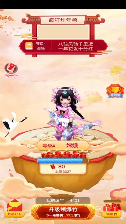 3、为大家设计了不同等级的年兽,通过大家积累的炮竹进行通关,然后就可以提升自己游戏的等级,领取当天奖励在排名中得到体提升,都会获得宝箱。