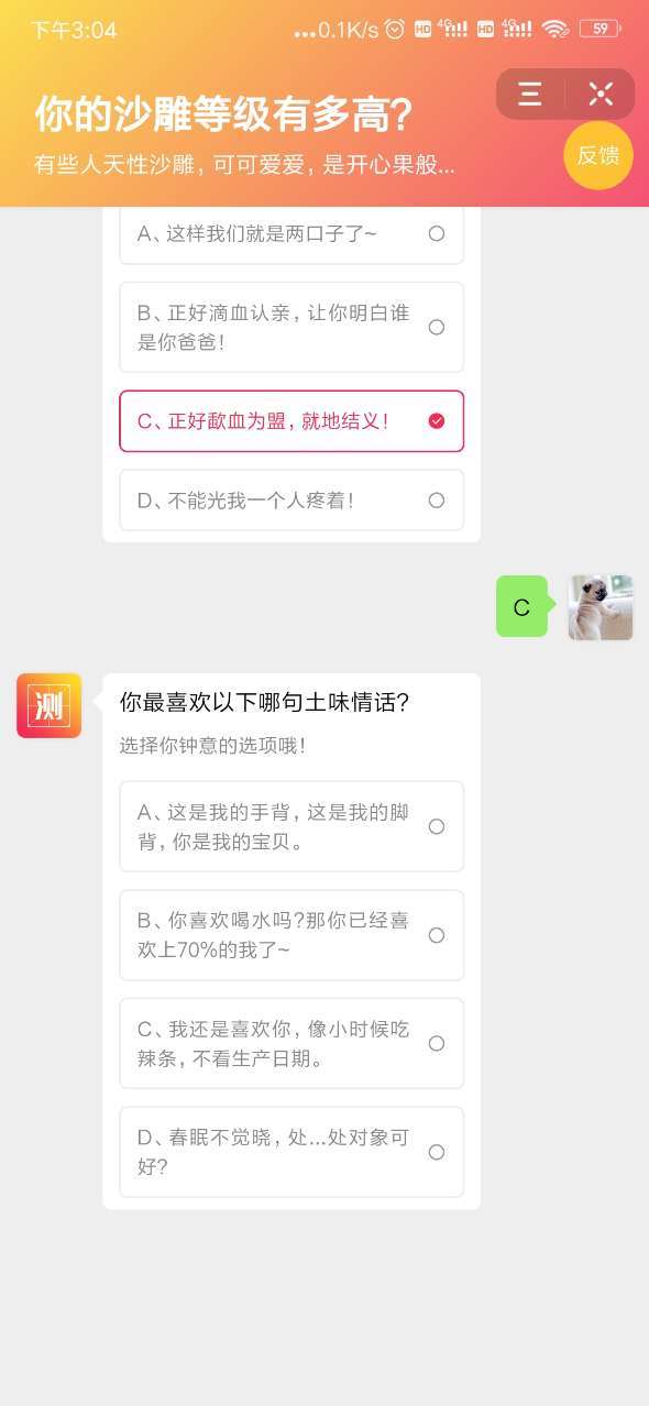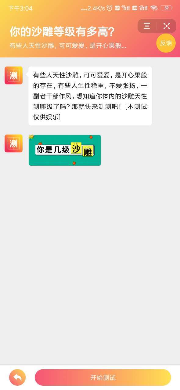 你的沙雕等级有多高游戏是一款足可以让你的所有的面具全部都脱落下来,在这一刻你就是沙雕之王的小清新休闲类趣味文字游戏。在游戏中你一定会感受到来自题目的恶意,我知道你千方百计就是想要掩盖你是一个彻头彻尾的沙雕的事实,但是事实通常是不能够如愿以偿的。