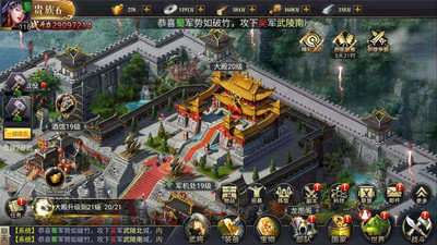 玩家在游戏中扮演一位三国时期的主公,拥有一座属于自己的主城,玩家以自己的主城为据点,积累资源,发展经济,强化军事力量,最终在游戏中称王称霸。当然游戏中有许多功能,玩家需要自己计划安排,利用这些有趣而实用的功能来使自己变的强大。玩家可以再地图上攻打流寇来获取资源和额外道具,或者攻打其他玩家主城来掠夺资源。