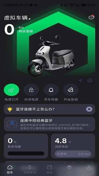 1、下载并打开甲胄动力app,就能一键搜索绑定两轮车设备。