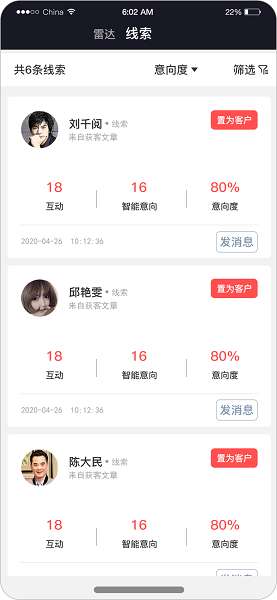 5、查看线索,了解客户的信息,便于进行管理,提供啊客户拓展的质量。