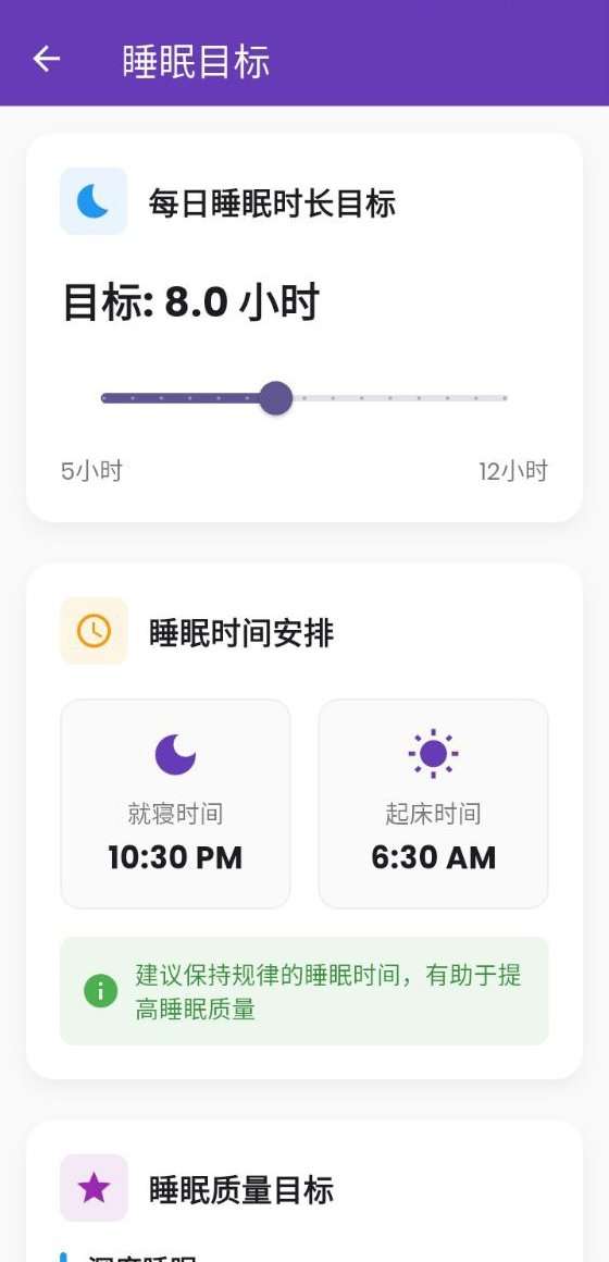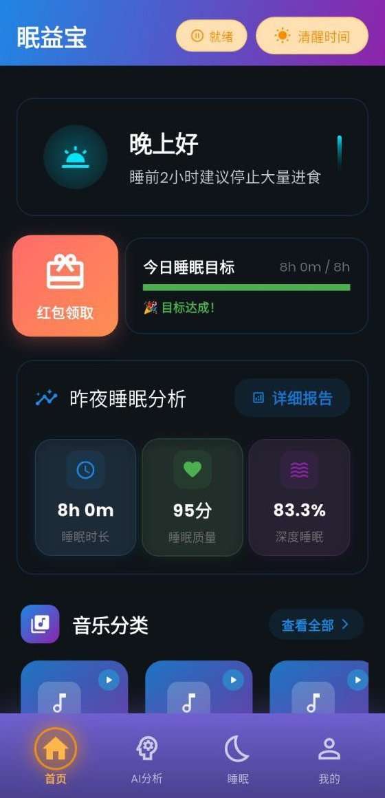 眠益宝app是一款集睡眠分析、助眠音乐和智能闹钟于一体的多功能睡眠健康软件。通过科学监测睡眠周期,提供沉浸式的放松音乐和温柔的唤醒服务,帮助用户提高睡眠质量,培养规律的睡眠习惯,让每一个夜晚都成为深度恢复的美好时光。定制睡眠时间和时间表目标,跟踪完成进度并提供奖励。提供科学的长时间午睡时间,帮助快速恢复能量。匿名分享睡眠数据和见解,交流改善经验和方法。
