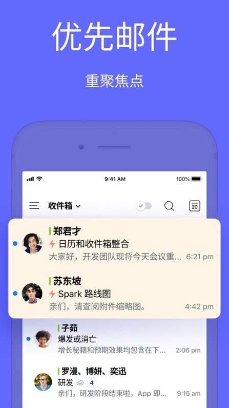 Spark手机版,以出众设计与简易上手脱颖而出,独具特色且内外兼修。专为专业人士及其团队免费带来业界领先的邮箱体验。智能聚焦的邮件服务,是我们为您精心打造的专属邮件体验。它全面兼容各类系统,支持多账号集中收件,助您聚焦重点、掌控全局,远离纷繁干扰。快来体验吧!