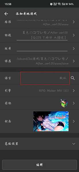 5、选择之后会回到刚刚添加游戏的时候的界面,然后点击语言那一栏最右边的查找标志的图标。之后会弹出选择语言的弹窗,如图所示,先点击左边的框框选中,然后点击右下角的“好的”确认就行了。
