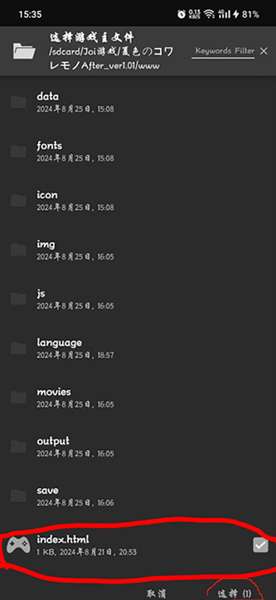 注意:找到文件夹内的www文件夹,打开www文件夹后选择后缀为HTML的游戏添加,一般左边都为游戏手柄标志。点击右下角的选择添加即可