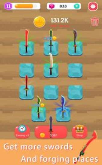 合并宝剑游戏红包版是一款全新独特合成玩法的趣味养成作品,拥有着多种不同颜色以及属性的宝剑需要你去制作合成,你需要不断的使用金币购买多种宝剑,更加合理的进行放置合成,并且收集到更多不同属性的宝剑,快速的赚取金币,不断的提升自己的操作能力吧。