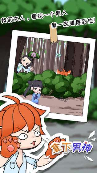 女追男,隔层纱,只要女孩子主动一点,爱情还不是手到擒来,拿下男神是一款非常有趣解谜游戏,玩家在游戏中将扮演一位可爱的女孩子,为了自己的爱情而奋斗,想尽一切办法拉近你们之间的距离,让他对你充满好感,不断的发挥你的想象力,创造一个浪漫的二人世界。