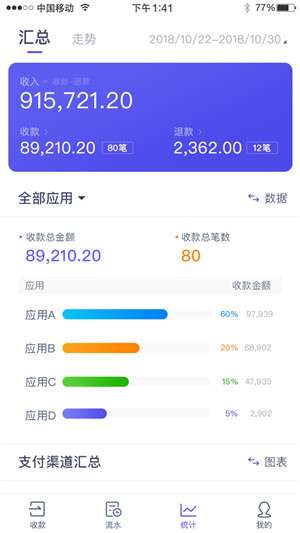 1、收款服务:可通过智能手机或平板电脑下载使用,还包括交易取消、历史收款和付款记录查询、电子采购订单等服务