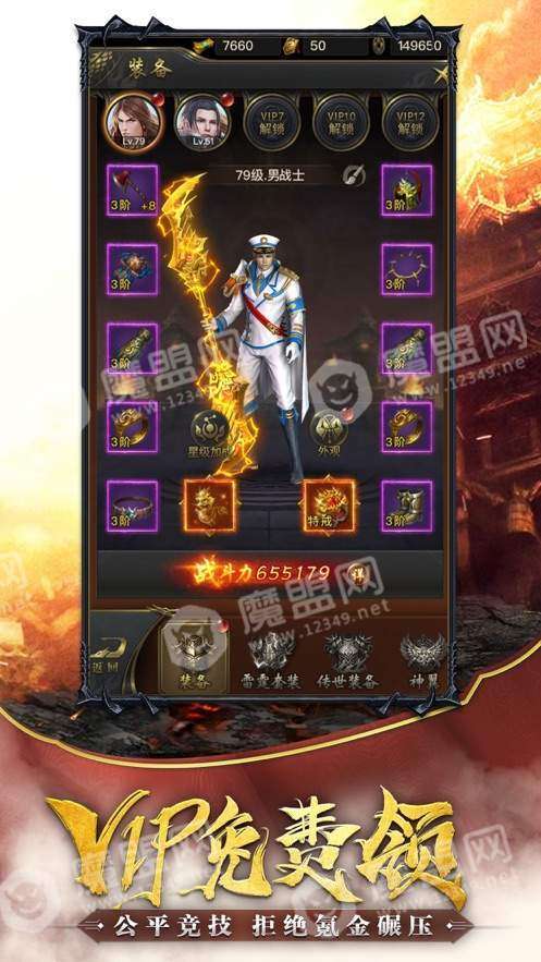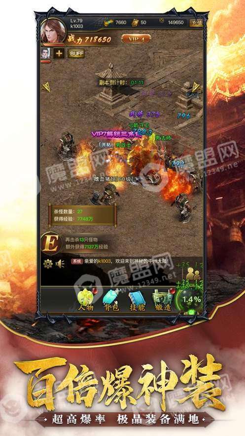 3、极品装备随便爆,超强属性为你加成,轻轻松松突破百万级别的战斗力.