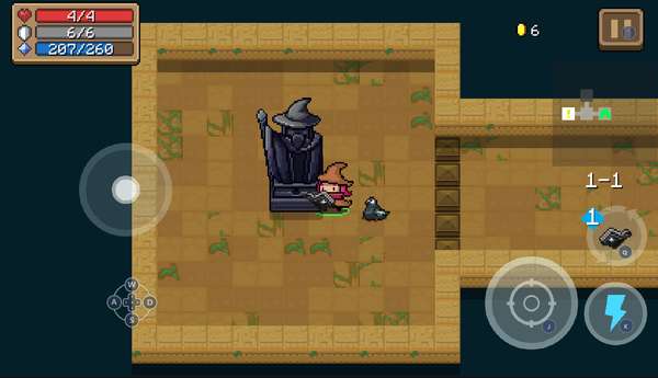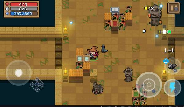 玩家可以携带一件初始武器进入闯关,或是从扭蛋机/入门宝箱中获取额外的武器。进入游戏后玩家需要消灭场景中的怪物从而通过关卡,玩家可在消灭怪物后获得能量,金币等奖励。每一个房间场景内的怪物被肃清后,在该场景内会刷新一个宝箱,玩家同样可以从其中获取能量、金币和武器等奖励。