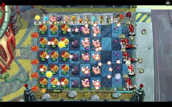 3、将植物放置在场景合适的地方,对所有的僵尸发起猛烈的攻击。