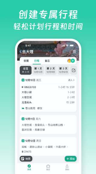 3、日程信息 用户可以制作自己的旅行日程时间和目的地等信息,通过APP联络管理移动。
