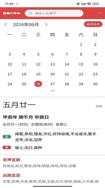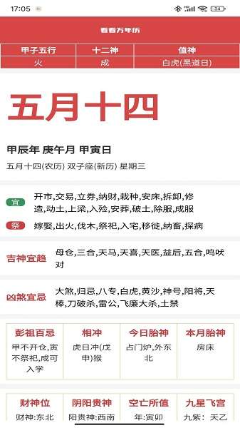 3、日历查询:在主界面上,直接查看当前日期的农历和节气信息,点击日期可以查看详细的吉凶宜忌。