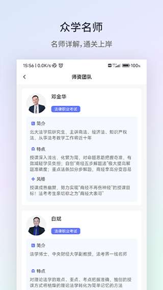 众学法考是专为法律职业资格考试而打造的一款法考学习平台,具备实景精讲、免费试听、智能题库、AI定制四大特色功能,能够帮助考生更好的理解知识点,让你轻松应对司法考试。同时,软件利用人工智能算法,能够实现一对一智能出题,再通过智能评估成绩精确预测考分,让用户可以牢记习题,提高成绩。软件内拥有专业的名师团队,在线授课,用户能快速的融会贯通学习的知识,提高学习效率,把握考试的难点,成功的通过法律职业考试。