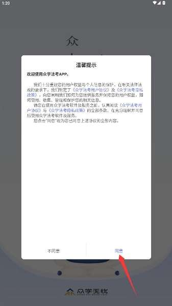 1、打开应用后仔细阅读用户协议和隐私政策,确认后点击同意按钮进入应用。
