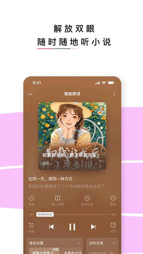 2、集成有声读物功能:内置AI语音阅读,多种音色可供选择,解放你的眼睛,你可以在通勤途中睡前“听”小说。