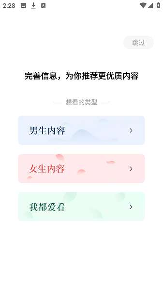 1、打开软件后可以设置自己的喜好,这样方便系统为你推荐你喜欢的书籍。