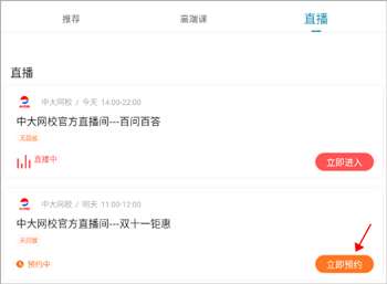 2、接着点击直播右侧的立即预约即可啦,到了时间软件会进行提醒。