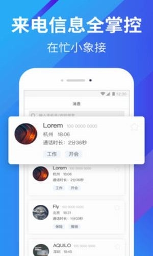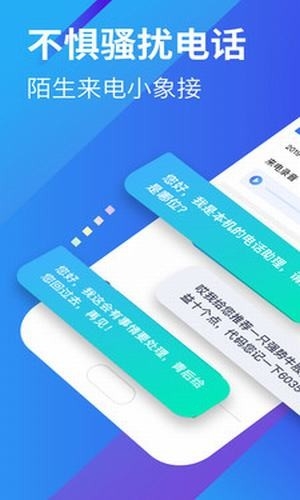 小象来电app是可以应答呼叫的机器人。当您拒绝或错过电话时,它可以帮助您接听电话,并进行记录以向您报告。他可以帮助您防止骚扰电话的骚扰,这样当您在会议,驾车等期间不方便接听电话时,您就不会受到打扰;在关机或处于飞行模式时,也不会错过任何重要的电话。 房地产销售,股票销售,贷款销售,教育销售,保险销售等各种骚扰电话,严重扰乱了我们的工作和生活节奏。用这款小象来电app就可以智能地识别骚扰对话的内容并输出记录,以使您远离骚扰电话。