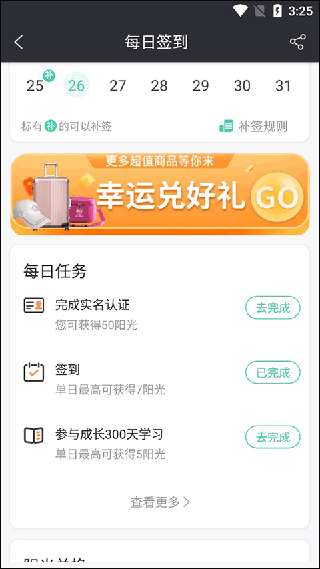 4、这个时候会有几个比较聪明的小伙伴关于问了“有没有其他获得阳光的渠道呢?:”当然有啦,就在我们签到界面的底部的每日任务板块内,完成任务也能获得数目不等的阳光,任务也都非常的简单。