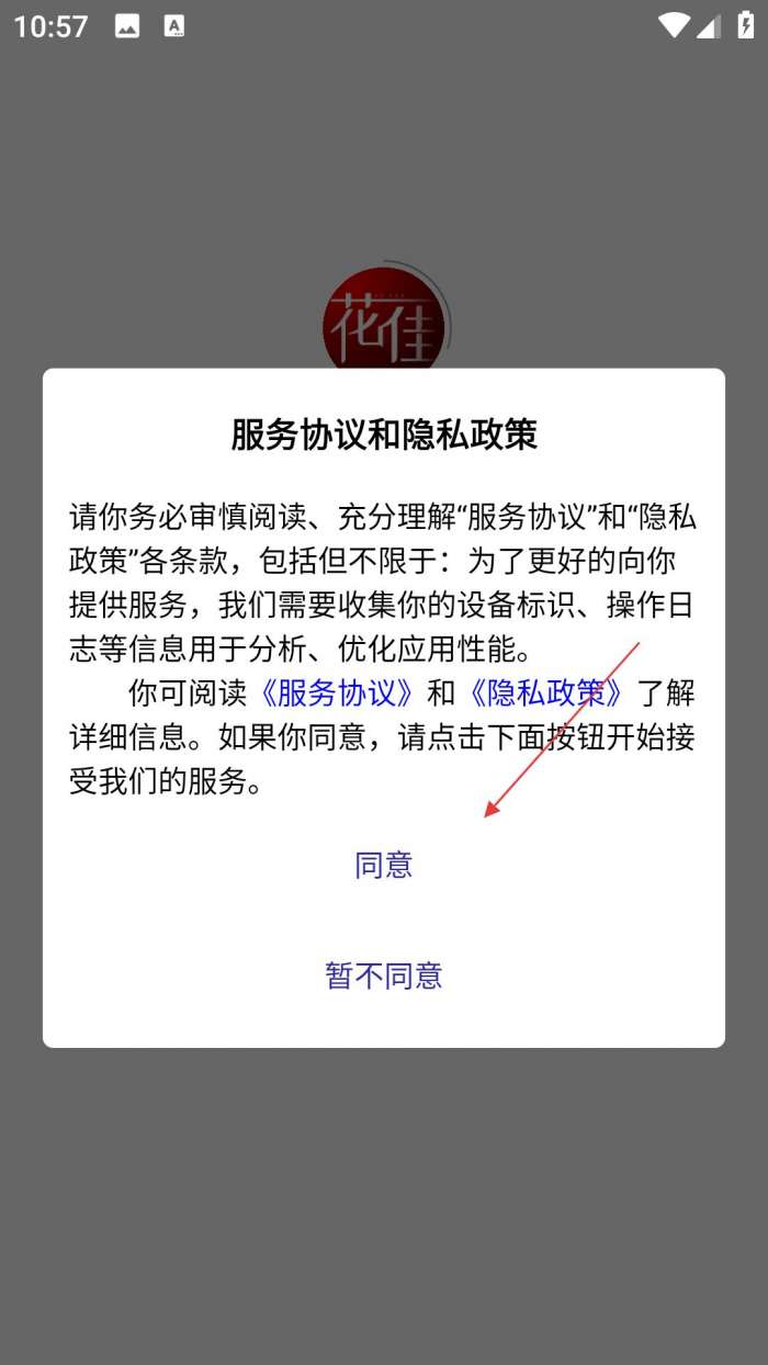 1、下载安装完成后进入,需在用户协议和隐私政策界面点击同意,接受相关条款后才能进入应用。