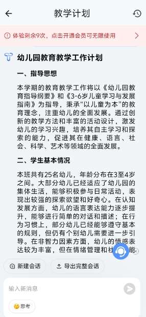 教师可以选择所需的功能(例如:教案设计),根据提示输入内容,即可生成完整教案。以人教版教材五年级语文《四季之美》一文为例,教师定义教学目标、设置课时后,就能输出完整的教案。此外,点击“导出”按钮,还能导出word版本,方便教师进一步修改和完善。