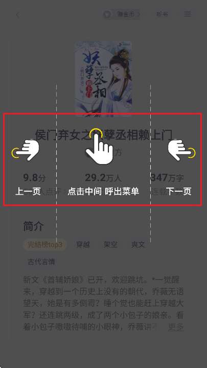 3、选择一本小说点击其封面可直接进入到阅读界面,如图所示,这里能提供操作手势指南。