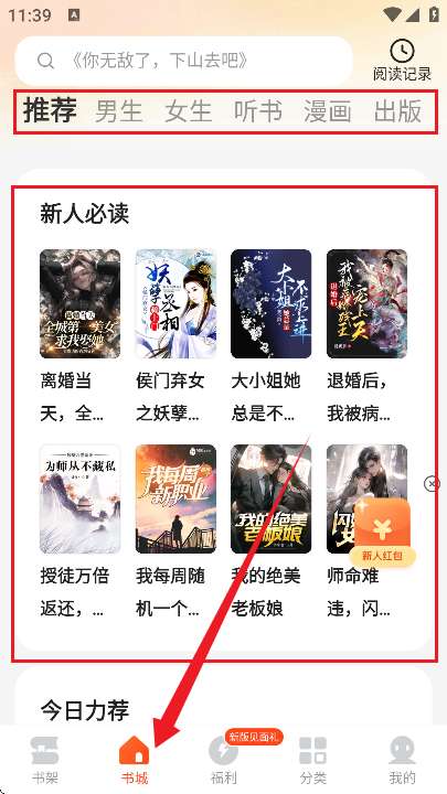 2、进入到软件首页-书城,如图所示,这里能提供丰富的小说资源,类型上包括男生、女生、听书、漫画、出版等。