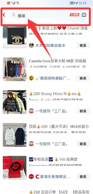 2、在顶部搜索栏输入服装关键词,获取相关商品列表。