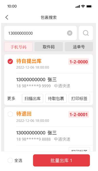 1、【便捷管理】流畅的包裹操作功能,以便于您快速完成包裹出入库,通知消费者取件。