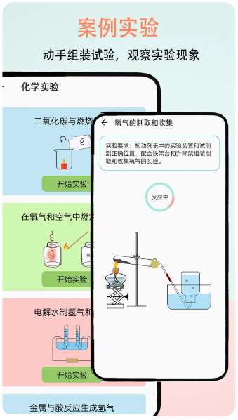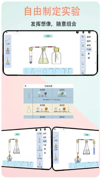 1、亲手在手机上任意组合实验装置,发挥想象力,运用所学化学知识,创造不同的实验组合。实验结束后,可以向用户提供实验结果和实验中使用的反应方程,使其清楚了解整个化学反应过程。