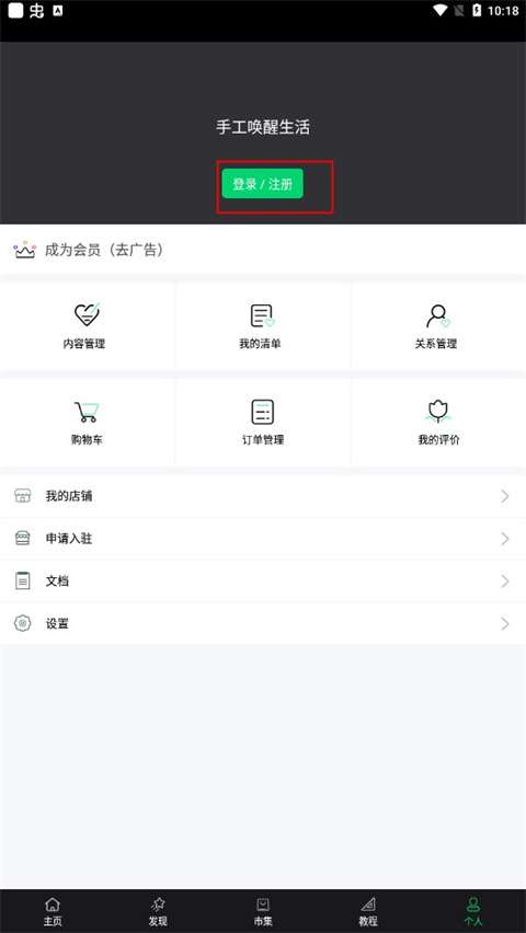 1、点击个人,然后点击登录注册打开,点击页面下方的发现。