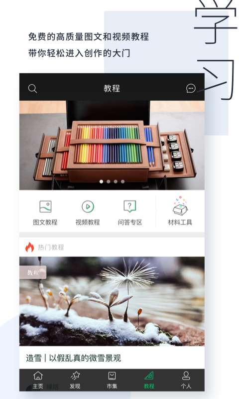 1、用户可以通过软件找到各种图文教程内容,并跟踪图文学习和创作过程。