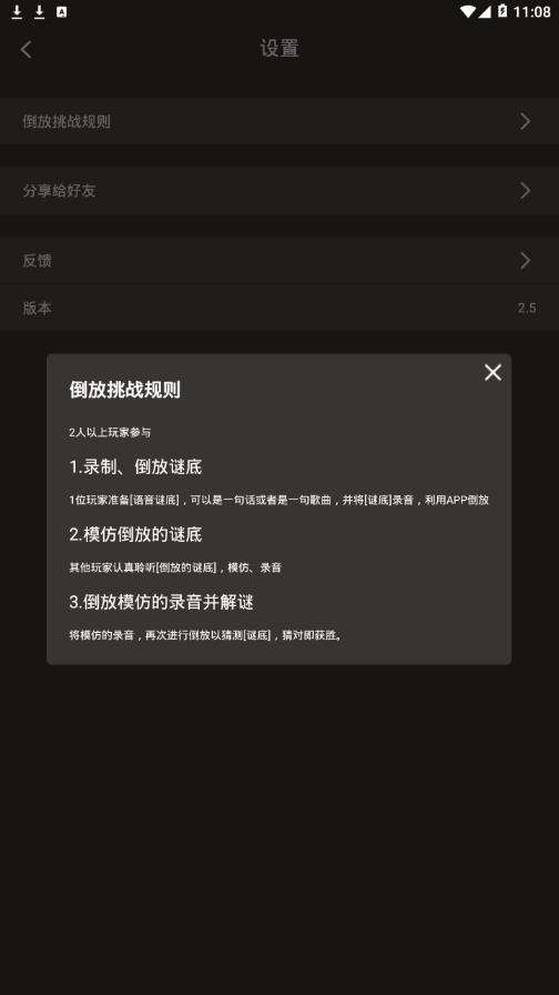 这款软件特别适合朋友聚会时活跃气氛,情侣间也可以做到访游戏,让两个人的感情更加甜蜜,不管你是普通说话还是唱歌,软甲都可以将它一键倒放,还可以说最近的网络流行语,来让对方猜,如果不好猜的话,可以调节速度,玩起来十分的有趣。